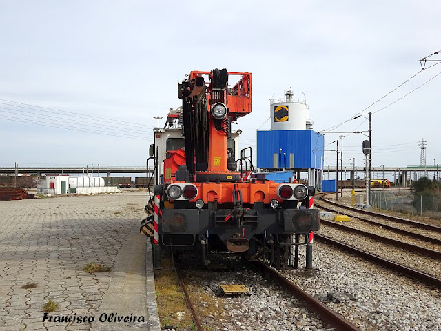 Máquina de reparação de cantenárias estacionada no Terminal Industrial das Praias do Sado em Setúbal.